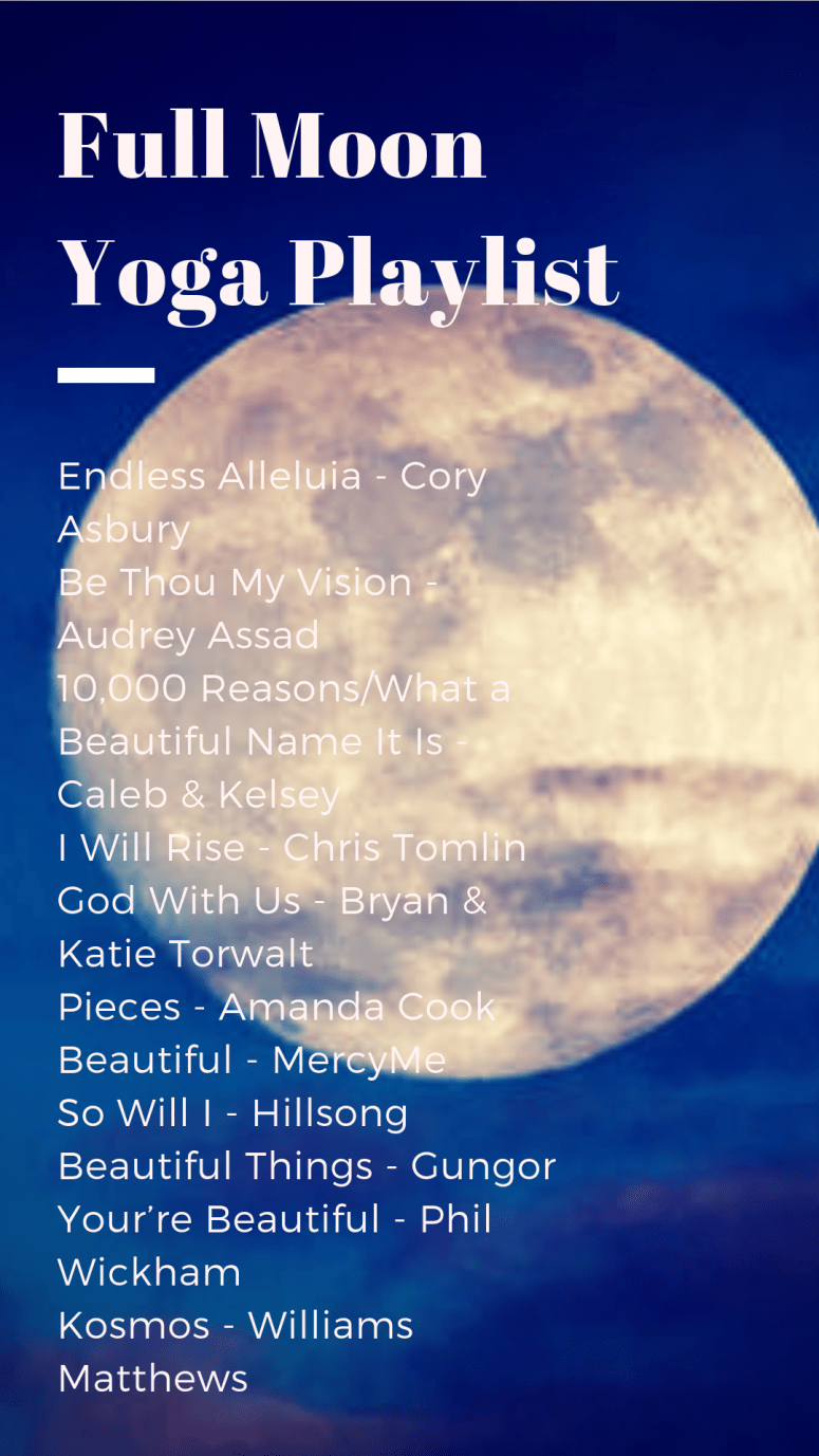 Teaching Moon Salutations is one of my favorite things to do. As they’re a cooling flow, honoring the Yin, cool, feminine energy of the moon, I put together this playlist that worked perfectly with my last full moon class that coincided with my Christ-Centered class last month!