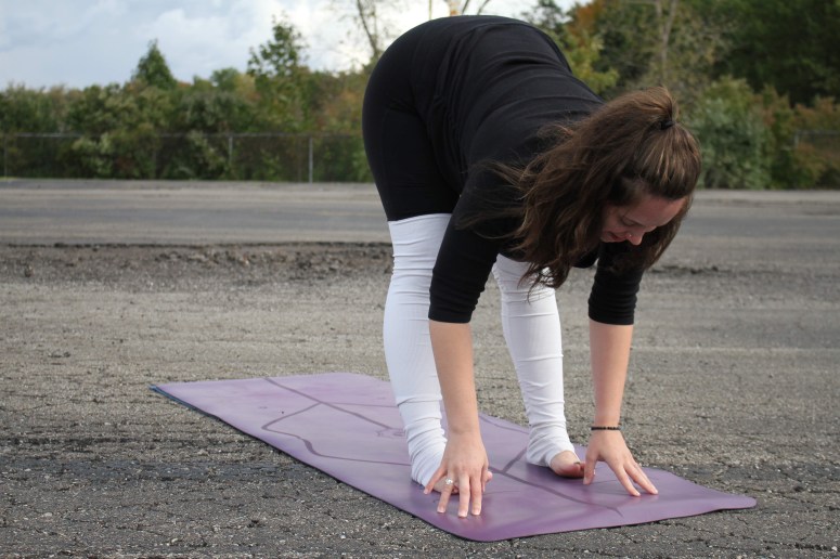 Plant your feet about hip width apart. Taking a deep breath in, reach your arms up overhead, creating length through the spine. As you exhale, keeping your back straight, fold your torso over your legs, bending at the hip. Soften your knees and swing your arms up and behind your back. Interlace your fingers at about your lower back and begin to lift the arms upward and over your head toward the floor in front of you. If you don’t quite reach to interlace the hands, use a small towel (or burp cloth!) to bridge the gap. Drop your head and give your upper body over to gravity, letting your head be heavy.