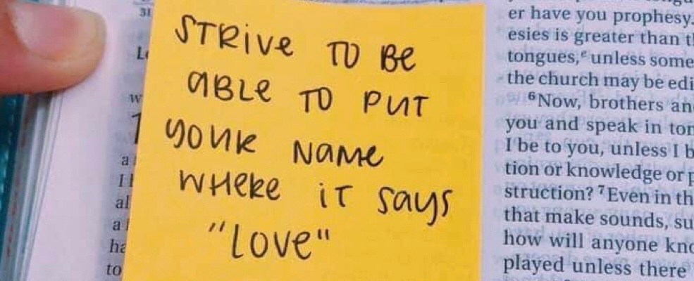 The picture includes a post-it that reads: “Strive to be able to put your name where it says ‘love.'”