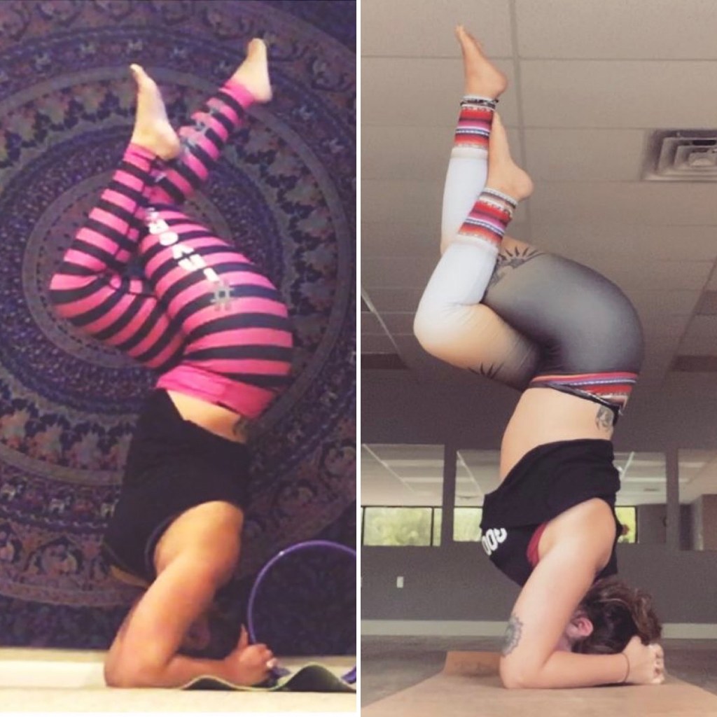 There’s just under under 4 years between the first pictures and 2 years between the second pictures, and even though I’ve been getting upside down on my head for a few years more than that, it hasn’t been until the last year or so that this pose actually FEELS strong 💪🏻 and it’s thrilling. ✨
